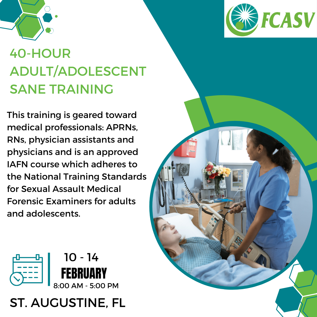 The 40-hour Adult/Adolescent SANE Training is geared toward medical professionals: APRNs, RNs, physician assistants and physicians and is an approved International Association of Forensic Nurses course which adheres to the National Training Standards for Sexual Assault Medical Forensic Examiners for adults and adolescents. Upon completion, the medical professional will have a clear understanding of the principles of trauma informed care and evidence collection to provide medical forensic exams to adults and adolescents that experience a sexual assault.